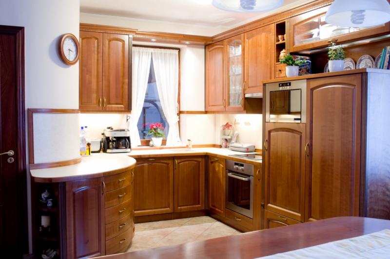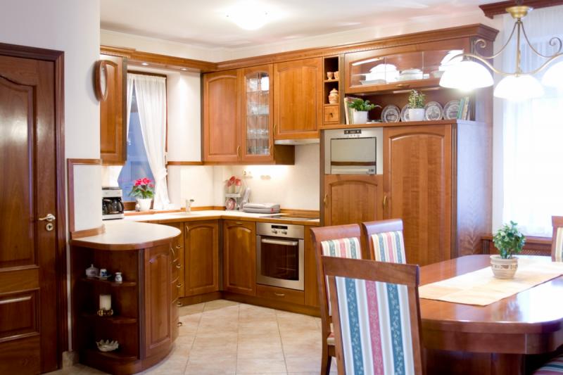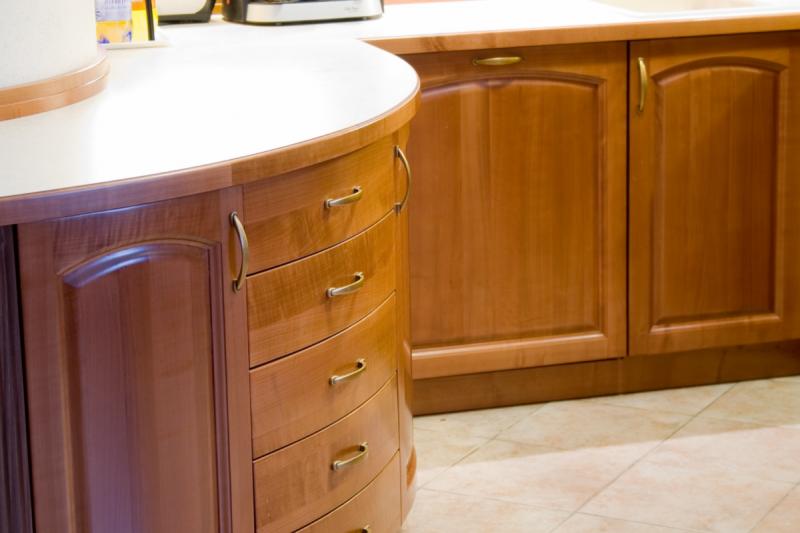 Konyhabútor filung betétes, saját gyártású cseresznyefa ajtólapokkal, diófa pillérlécekkel díszítve, cseresznyefa furnér oldalakkal, dekor hátfallal magas minőségű vasalatokkal. A megrendelő speciális kérése volt, hogy a konyhabútor kövesse a konyha falának ívelt vonalát, melynek eredményeképp születtek a különleges ívelt fiók előlapok és ívelt ajtólapok.