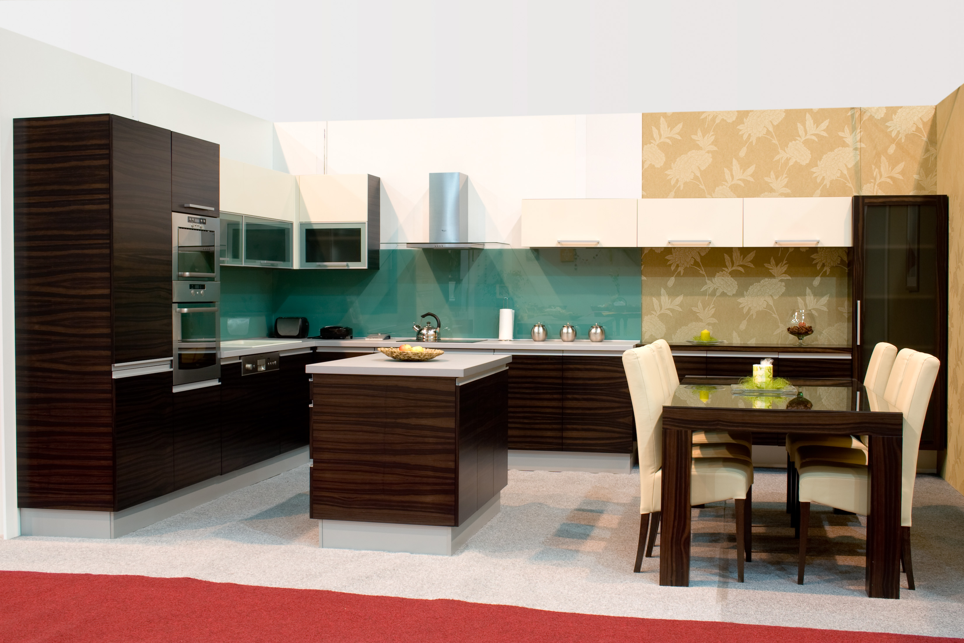 Minimál stílusú konyhabútor és hozzá tartozó étkező asztal.