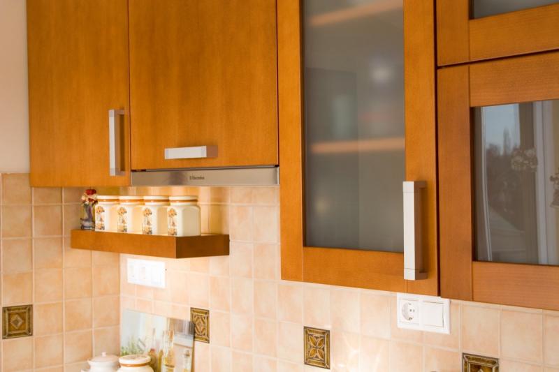 Modern bükk furnérozott konyha, cseresznye színre pácolva, egyedi gyártású világítás technikával, minőségi BLUM fiókokkal és felnyíló vasalattal.