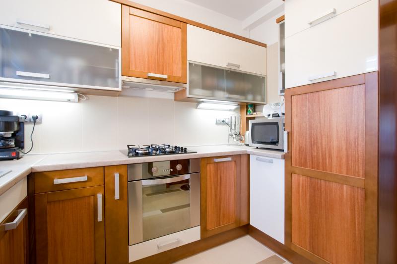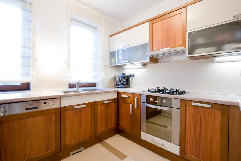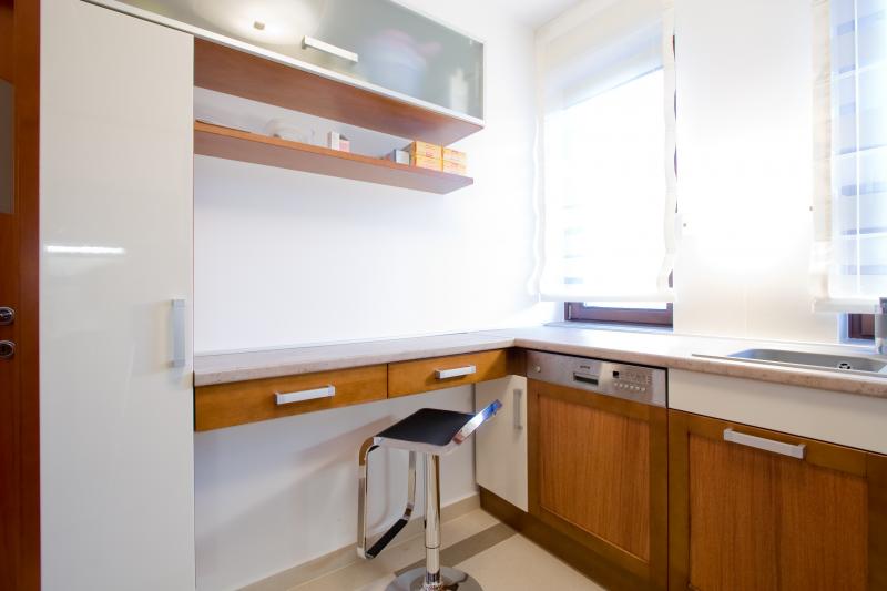 Modern konyhabútor tömör bükk fa keretes profilú fronttal. Az ajtólapokat különlegessé teszi a Meranti egzota fa furnérozott lemez betét. A felső elemeknél megjelenik a magas fényű festett MDF lap és az Alu keretes üvegajtó is. Az alsó és felső elemek között a munkalappal szín azonos dekoros fal borítás.